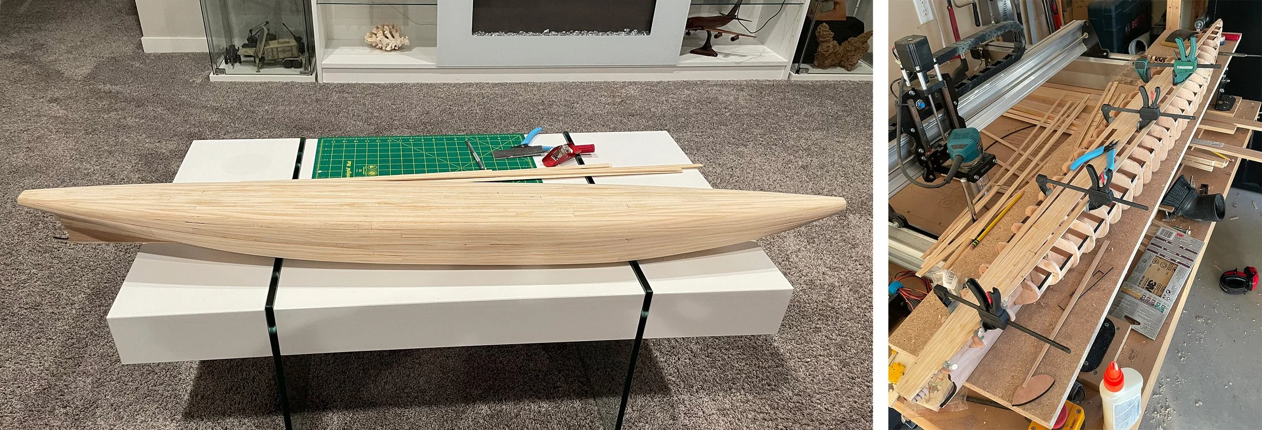 The completed hull on the left and the in-progress hull on the right.